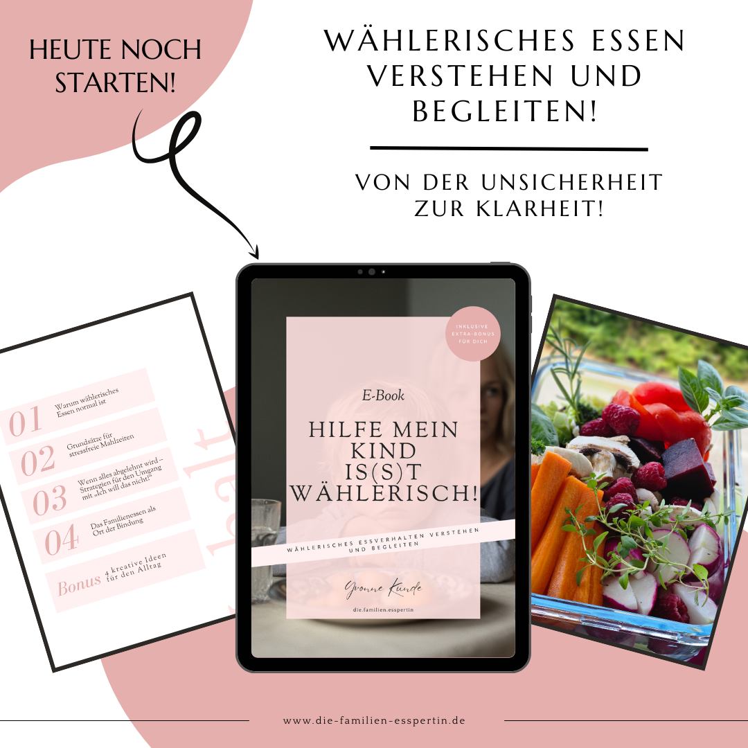 • Verstehen statt Frust: Erhalte Einblicke, warum wählerisches Essen bei Kindern ganz normal ist, und lerne, wie du gelassen damit umgehen kannst.